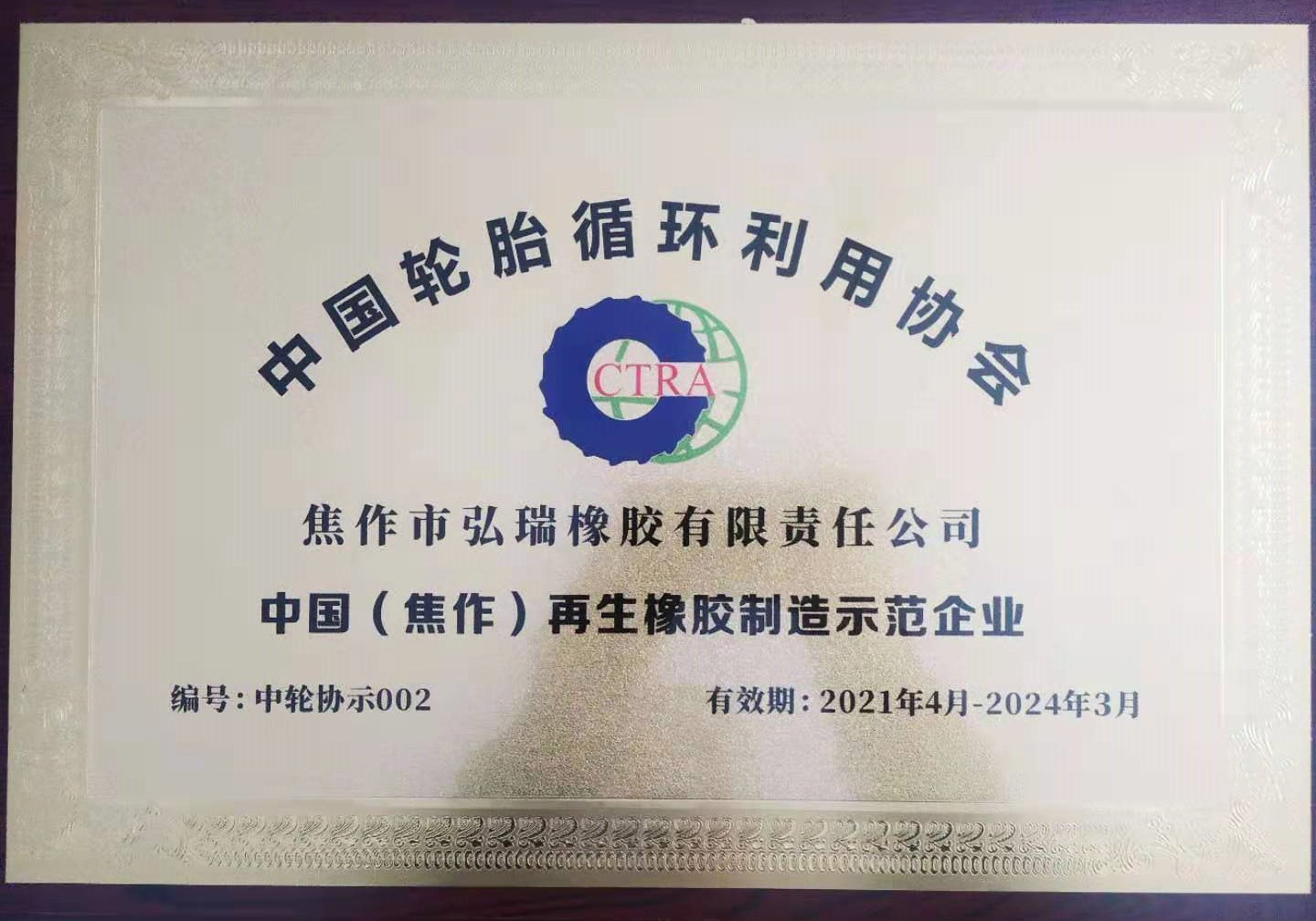 公司榮獲中國輪胎循環(huán)利用協(xié)會(huì)多項(xiàng)榮譽(yù)稱號(hào)
