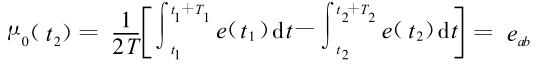②正負(fù)勵磁下的同相位采樣。圖1 是對應(yīng)低頻矩形波勵磁形式下的典型電勢信號形式,按上述關(guān)系在一個勵磁周期下 ,若假設(shè) t 1 和 t 2 點(diǎn)為工頻干擾的等效干擾點(diǎn) , 且采樣寬度 T =T 1 =T 2 ,則 e ab 的基本算式為