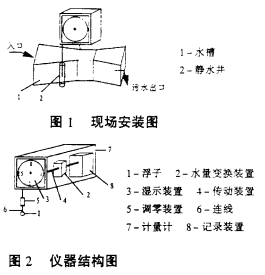 本儀器現(xiàn)場安裝結(jié)構(gòu)如圖(1)所示,其原理是水通過水槽1(該設(shè)計是以帕歇爾水槽(Parshall)為標準),將水量變換成標準水位,由浮子3(參看圖2)帶動水位流量變換裝置4,該變換裝置將變換好的流量信號經(jīng)傳動裝置6傳給顯示裝置5顯示瞬時流量,并同時經(jīng)傳動裝置6將這一信號傳給記錄裝置10,這一裝置采用了自記鐘的原理,在特制的記錄紙上將流量信號按時間及日期記錄下來,記錄滿后由儀表操作者收回統(tǒng)計: