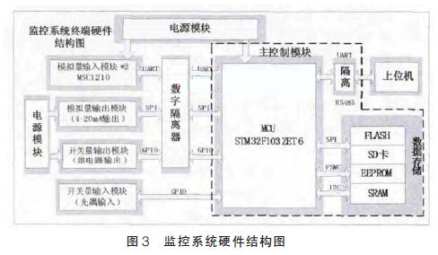現(xiàn)場浮子流量計監(jiān)控系統(tǒng)的總體結(jié)構(gòu)如圖2所示。其中硬件系統(tǒng)主要功能是模擬量(溫度、儀表信號)的采集,模擬量(4~20mA 電流)的輸出,開關量的輸入輸出以及遠距離RS485串行通訊和數(shù)據(jù)存儲。其中監(jiān)測系統(tǒng)硬件結(jié)構(gòu)如圖3 所示。為增強監(jiān)測系統(tǒng)的抗干擾能力, 本設計采用帶隔離的電源模塊以及數(shù)字隔離器確保系統(tǒng)能夠高效穩(wěn)定工作。