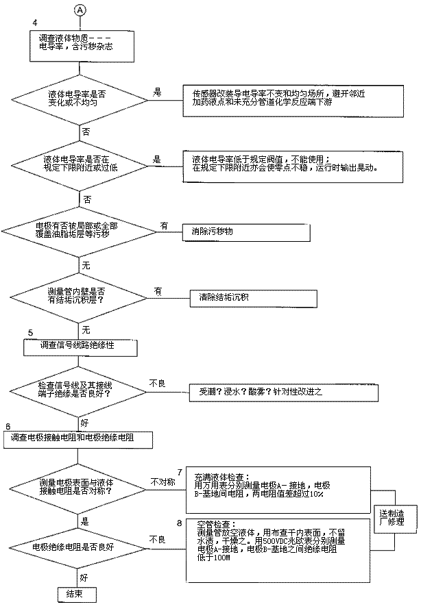 檢查流程圖*3項(xiàng)。管道雜散電流等外界干擾影響主要靠發(fā)煙硝酸流量計(jì)良好的接地保護(hù),通常要求接地電阻小于1000,不要和具他電機(jī)電器共用接地。有時(shí)候環(huán)境條件較好,發(fā)煙硝酸流量計(jì)不接地亦能正常工作,但是一旦良好環(huán)境不存在,儀表會(huì)出現(xiàn)故障,屆時(shí)再作檢查會(huì)帶來堵多麻煩。