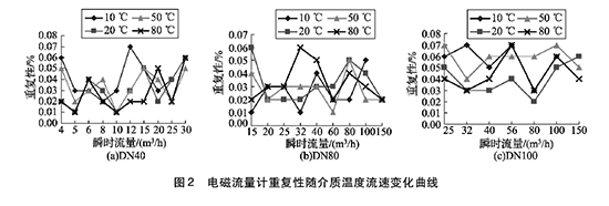 將實(shí)驗(yàn)測(cè)得的電磁流量計(jì)dn350在不同溫度及流速下的重復(fù)性數(shù)據(jù)整理,特性曲線如圖2所示,3組曲線分別對(duì)應(yīng)DN40,  DN80,  DN100的3塊電磁流量計(jì)dn350的重復(fù)性曲線。