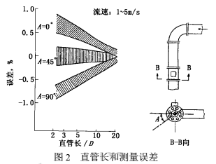 流體流過(guò)彎管后,下游產(chǎn)生流速分布畸變,若是兩只鄰近相接的不同平面彎管,除流速分布畸變外還會(huì)有漩渦。這些現(xiàn)象要影響裝在下游的大部分類型流量?jī)x表(除容積式等少數(shù)類型外)的測(cè)量值,因此通常要求在流量?jī)x表安裝點(diǎn)之前有一定長(zhǎng)度直管段,改善進(jìn)入儀表的流動(dòng)狀況。稀硝酸流量計(jì)受彎管影響較小,直管長(zhǎng)度要求也遠(yuǎn)低于節(jié)流差壓式、渦街式等其他流量?jī)x表。但是當(dāng)前稀硝酸流量計(jì)精度為測(cè)量值的0.5%,甚至0.2%~0.4%,即使影響量較小,還是受到人們的關(guān)注。