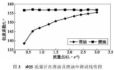 依據(jù)表3測試數(shù)據(jù),經(jīng)計(jì)算可得,Φ25流量計(jì)在滑油及燃油中測試結(jié)果如表4所示,測試線形圖如圖3所示。