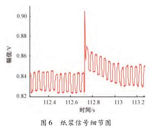 為了進(jìn)一步研究水煤漿信號的特點,將其與紙漿信號進(jìn)行對比。通過分析課題組采集的25Hz矩形波勵磁下的紙漿信號發(fā)現(xiàn),在同樣流速下,測量介質(zhì)為紙漿時,傳感器輸出信號經(jīng)調(diào)理放大后能明顯看到與流量相關(guān)的感應(yīng)電動勢信號,且其漿液干擾僅為數(shù)十毫伏,要遠(yuǎn)小于水煤漿信號中的漿液干擾,如圖5所示。對圖5所示的紙漿信號進(jìn)行局部放大,得到如圖6所示的信號??梢?,紙漿信號中的漿液干擾持續(xù)的時間也遠(yuǎn)小于水煤漿信號中的漿液干擾,且頻率較低。