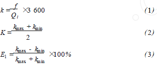 過熱蒸汽流量計在標準水裝置上,分別用頻譜分析和脈沖計數(shù)的方法進行標定,流體介質(zhì)為水未加氣體,采用的標準傳感器為精度等級為0.2級的電磁流量計。在每個流量測量點上的儀表系數(shù)用公式(1)計算,然后用式(2)計算得到*終儀表系數(shù)K。Ql為被測水的流量值,f為每一個流量點得到的頻率,k為每個測量點得到的儀表系數(shù)。kmax、kmin分別為試驗流量范圍內(nèi)得到的*大與*小的儀表系數(shù)。儀表系數(shù)的線性度E1用式(3)來計算。