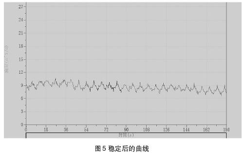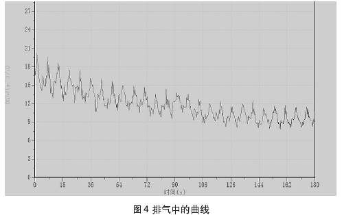 圖4、圖5中所示曲線為測量過程中所截取的集流傘中所聚集的氣相,通過排氣通道排出時與排出后的測量曲線。測試過程中錄取到的儀器排氣的過程,當(dāng)集流傘完全支開后仍需要開啟流量測試進行實時檢測,否則可能會錄取資料失真。