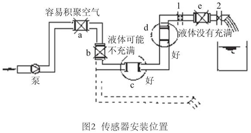 液體流動(dòng)方向必須與傳感器殼體上箭頭方向一致。對(duì)于能正反向測(cè)量的液氮流量計(jì),若方向不一致雖仍可測(cè)量,但設(shè)定的顯示流動(dòng)正反方向不符,必須改正之。若拆傳感器工作量大,也可改變傳感器上箭頭方向和重新設(shè)定顯示儀表符號(hào)。管道未充滿液體主要是管網(wǎng)工程設(shè)計(jì)或傳感器安裝位置不妥,使傳感器測(cè)量管內(nèi)不能充滿液體。應(yīng)采取措施,避免安裝如圖2所示a,e位置和以虛線管排放時(shí)b位置,改裝到c,d位置。