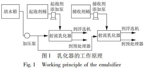 選煤廠浮選藥劑乳化裝置是將藥劑和水制成乳化液,實現藥劑的合理使用,將對浮選效果和節(jié)約藥劑起到一定的作用。在使用中可根據藥劑和水的配制比例觀察藥劑的乳化效果,通過乳化器操作箱內的的電位器調整水泵轉速,即調整乳化壓力。自動加藥控制是根據入浮流量與入浮濃度的檢測結果,控制起泡劑與捕收劑的加入。乳化器的工作原理如圖 1 所示。