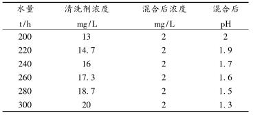 (2)加酸期間附企水處理公司人員負(fù)責(zé)每0.5h在高架水槽處化驗(yàn)污環(huán)水pH值,每2h監(jiān)測(cè)一次高架水槽內(nèi)掛片腐蝕情況,將化驗(yàn)結(jié)果告知燃?xì)鈲徫蝗藛T,崗位職工負(fù)責(zé)記錄。當(dāng)pH小于6時(shí),附企給水人員在高架水槽處加入堿液進(jìn)行調(diào)整,同時(shí)根據(jù)洗滌塔循環(huán)水量變換情況調(diào)整清洗劑濃度見(jiàn)表3。