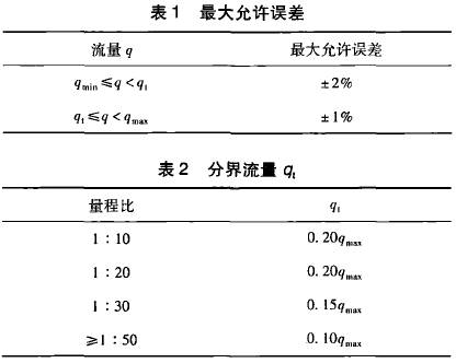 在GB21391--2008《用天然氣渦輪流量計測量天然氣流量》對分界流量q,有明確的定義,即低于該流量要采用擴(kuò)展誤差限的流量值。標(biāo)準(zhǔn)*5.2條從*大允許誤差和量程比兩方面對分界流量做出了規(guī)定,且明確了量程比是在*大允許誤差范圍內(nèi)流量計的*小流量和*大流量之比。該標(biāo)準(zhǔn)中對渦輪流量計要求的*大允許誤差如表1所示,量程比與分界流量q,的關(guān)系如表2所示。