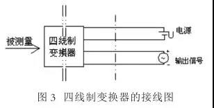 三線制變換器的接線圖如圖 2 所示,電流輸出系統(tǒng)除了兩根電流傳輸線以外,還有一根電源線向變壓器提供電源。三線制就是電源正端用一根線,信號輸出正端用一根線,電源負端和信號負端共用一根線。其供電大多為 DC 24V , 輸出信號有 DC4-20mA ,負載電阻為 250Ω 或者 DC0-10mA ,負載電阻為 0-1.5kΩ ;有的還有 mA 和 mV 信號,但負載電阻或輸入電阻,因輸出電路形式不同而數(shù)值有所不同。