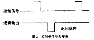 其外部特性如圖2所示。其工作原理是,每當在“控制信號”端加一正脈沖(寬度0.2ms),控制卡便通過換能器發(fā)一束超聲波,當超聲波遇被測污水反射后又被換能器接收,控制卡便通過“邏輯輸出”端輸出一“返回脈沖”。通過計量“控制信號”到“返回脈沖”之間的時間T便可按下式計算出換能器距被測污水表面的距離H,由于安裝時換能器固定在污水的上方(高度不變),因此,換能器距污水底部的距離HO(其值已知)減去H即為污水液位H1。