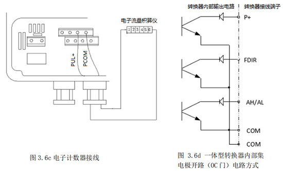 1.5 頻率(脈沖)、上下限報警、流向標示等輸出均為集電極開路的電平輸出信號。
